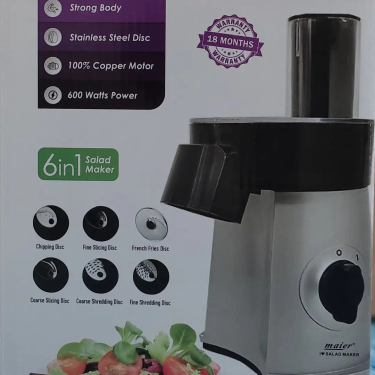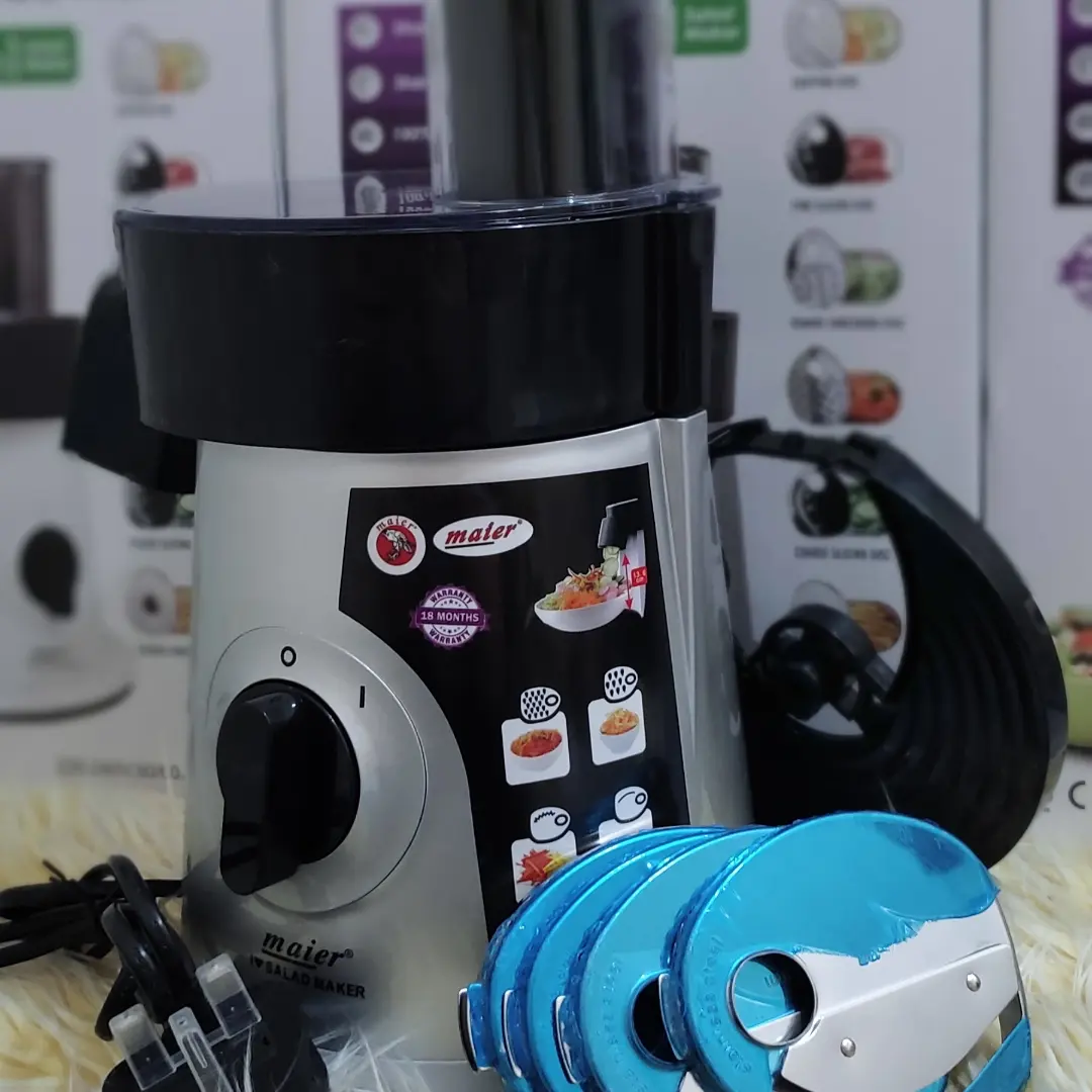 سالاد ساز برند مایر آلمان با تعداد تیغه: شش تیغه (غه سالاد + دیسک خلال سیب زمینی) توان موتور: 600 وات، جنس تیغه: استیل ضد زنگ، جنس بدنه: پلاستیک تمام فشرده محکم. دارای ۵ رنده استیل ضد زنگ برای ورقه کردن ،رنده کردن و خلال کردن سبزیجات، دارای دهانه عریض، قابل استفاده برای انواع سبزیجات ، پنیر، سیب زمینی و گوشت.